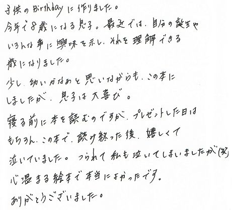 寝る前に本を読むのですが、プレゼントした日はもちろん、この本で、読み終わった後嬉しくて泣いていました。