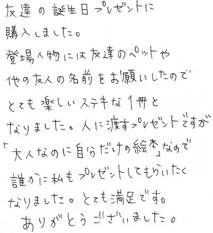 友達の誕生日プレゼントに購入しました。 登場人物には友達のペットや他の友人の名前をお願いしたので とても楽しいステキな1冊となりました。 人に渡すプレゼントですが 「大人なのに自分だけの絵本」 なので誰かに私もプレゼントしてもらいたくなりました。 とても満足です。 ありがとうございました。