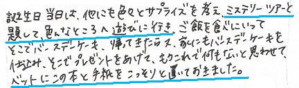 ロマンチックなお店でディナーをしたり、2人の思い出の場所で絵本を渡す方が多いようです!