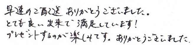 早速のご配送ありがとうございました。とても良い出来で満足しています!プレゼントするのが楽しみです。