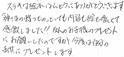 ステキな絵本ほんとうにありがとうございます。「神さまの贈りもの」とっても内容も絵も優しくて感激しました!!友人のお子様のプレゼントにお願いしたのですが今度は自分の子供にプレゼントします。