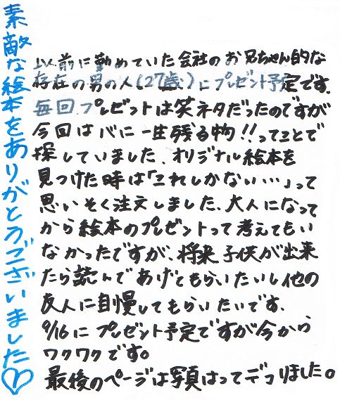 オリジナル絵本を見つけた時は「これしかない、、、」って思い、そく注文しました。